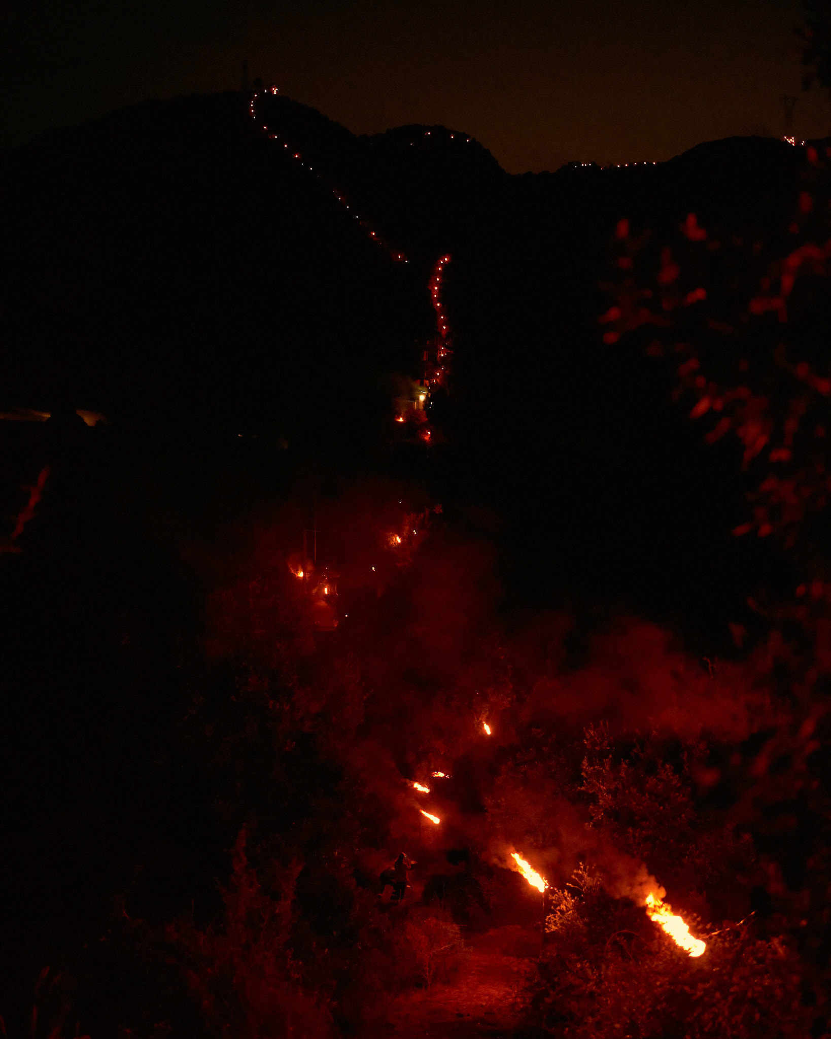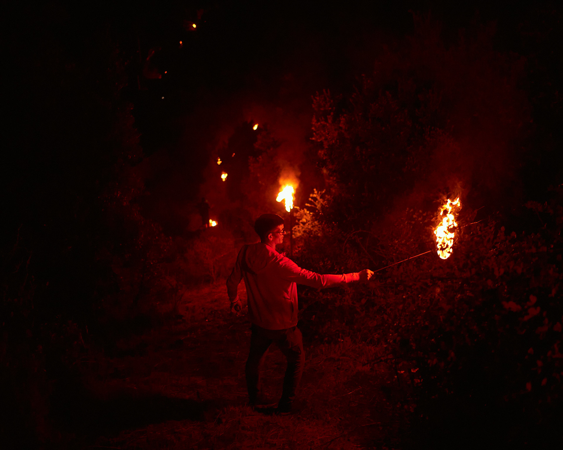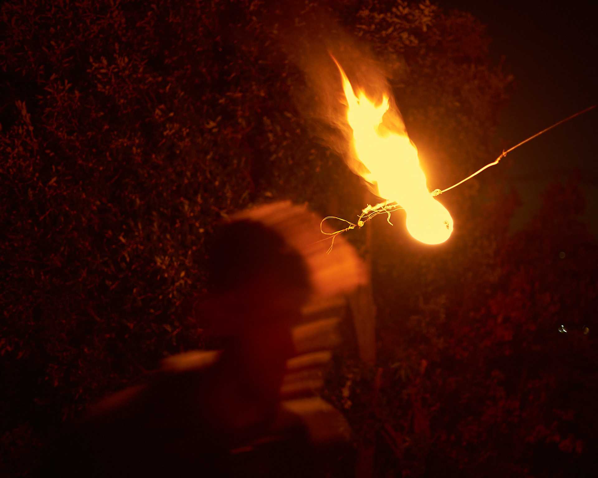 L’odore del combustibile pervade l’aria, penetrando nelle narici, mentre il bagliore delle fiamme di ogni pupattolo proietta figure allungate che si dissolvono nell’oscurità. È il riflesso dell’uomo che si fonde con le creature della notte al cospetto della natura.