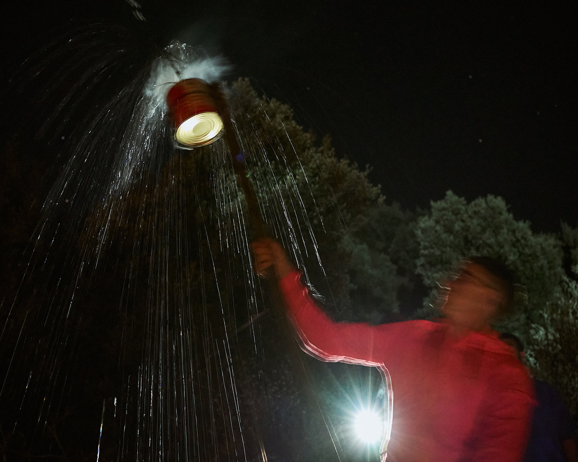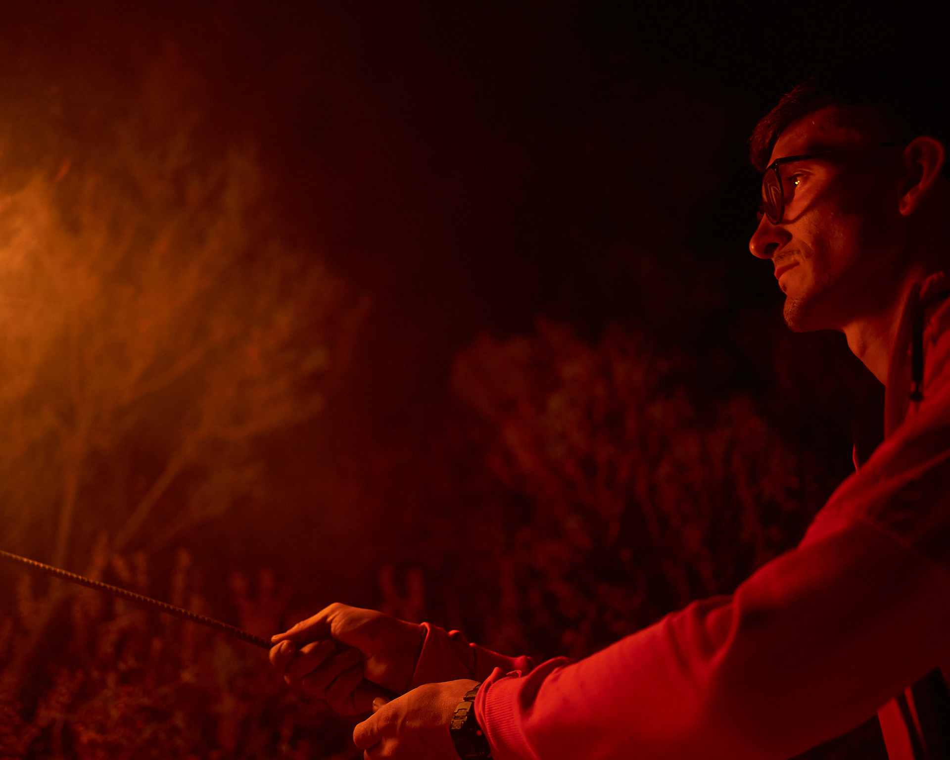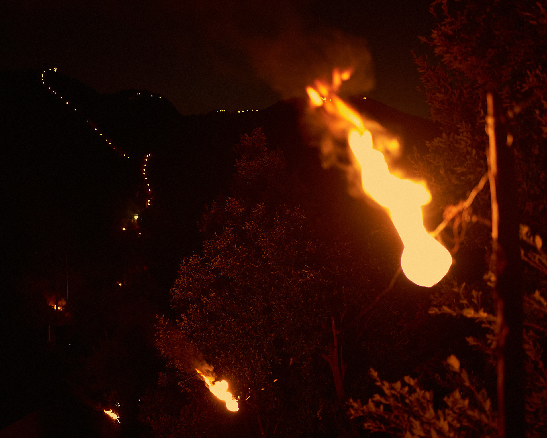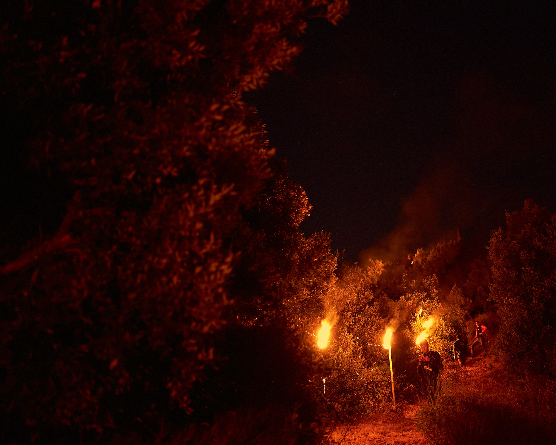 L’odore del combustibile pervade l’aria, penetrando nelle narici, mentre il bagliore delle fiamme di ogni pupattolo proietta figure allungate che si dissolvono nell’oscurità. È il riflesso dell’uomo che si fonde con le creature della notte al cospetto della natura.