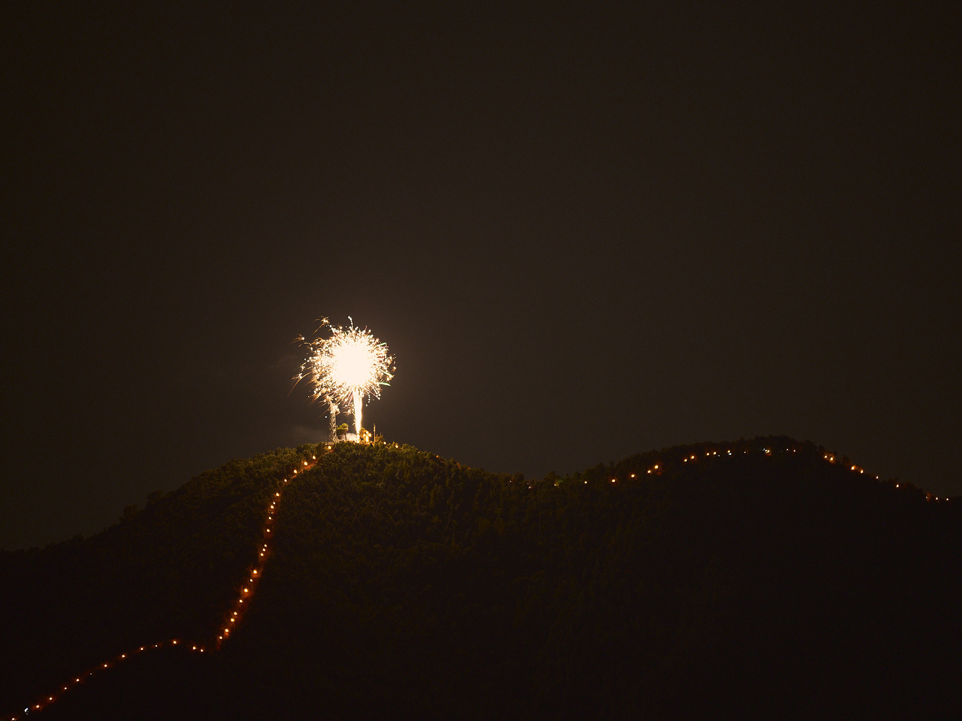 Alle prime note del crepuscolo, quando il sole cala e il buio inizia a intonare il suo canto, i gruppi risalgono le cime lungo i sentieri per accendere contemporaneamente i pupattoli. In quel momento sospeso, sembra che il tempo si sia fermato; ogni suono si amplifica, e in lontananza si percepiscono gli echi e le voci degli altri partecipanti. Tra l’oscurità del paesaggio e l'adrenalina di quel breve istante, lo scenario si carica di un'aura magica.